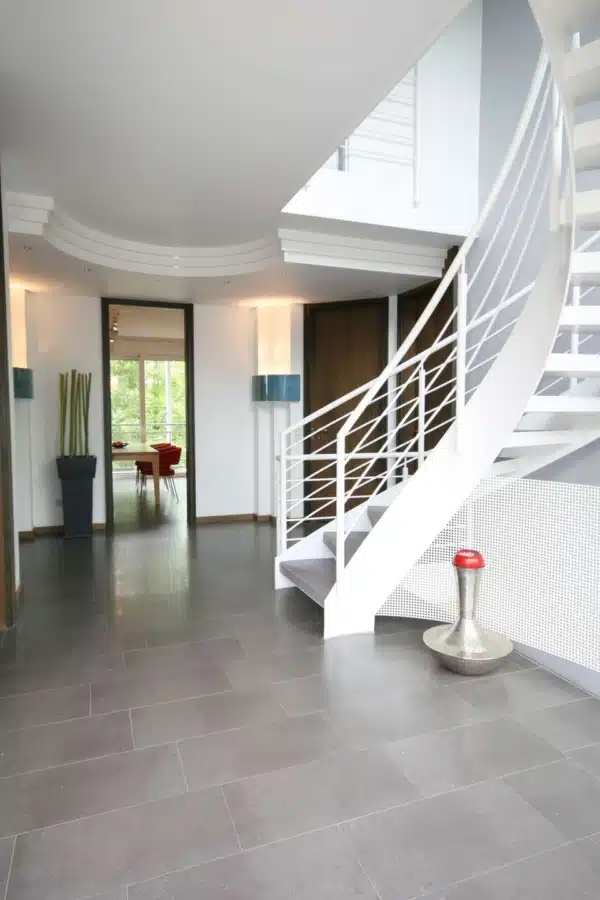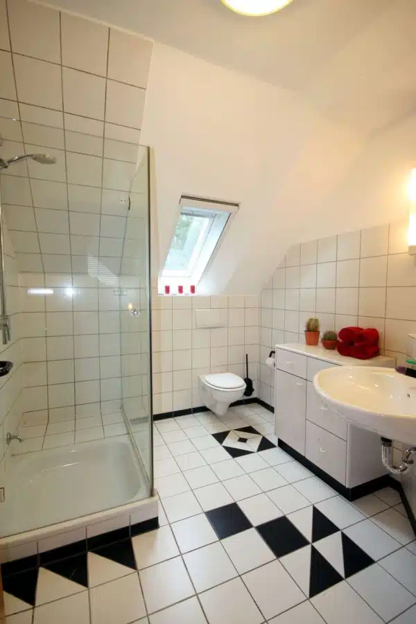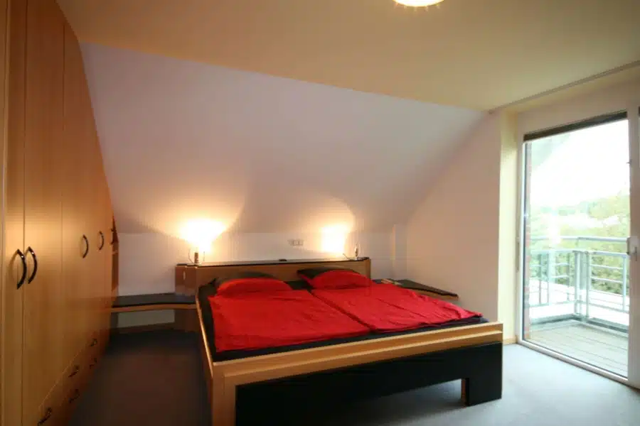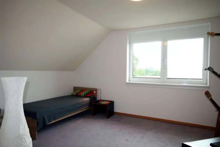 Im Obergeschoß angekommen über die hochwertige Stahltreppe mit Stahlbetonstufen die zurzeit mit Teppich belegt sind, betreten Sie durch den Flur, der mit einer Glastür vom Obergeschoß getrennt ist, den Schlaftrakt des Hauses. Hier sind insgesamt vier Schlafzimmer und zwei Bäder vorhanden. Ein Bad ist direkt vom Elternschlafzimmer zugänglich und das zweite Bad befindet sich im Flur. Beide Bäder sind modern gestaltet und verfügen über weißes Sanitär.