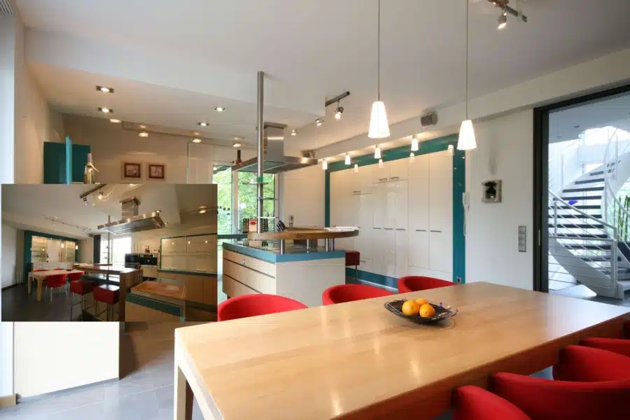 Das sehr moderne Haupthaus bietet Ihnen vom Erdgeschoß bis in den Spitzboden eine besonderen Atmosphäre, die Sie zum Wohlfühlen einlädt. Der große Küchenbereich, ca. 34 m² groß mit der sehr hochwertigen Einbauküche, die auf Wunsch übernommen werden kann, bietet Ihnen als Zentrum für die tägliche Kommunikation alle moderne Facilitäten die Sie in der heutigen Zeit erwarten können. Alle Geräte sind vom namenhaften Hersteller Miele.